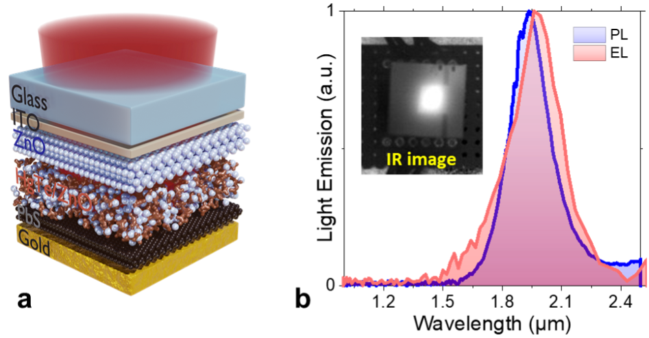 Légende : (a) Schéma l'empilement de couches ITO / ZnO / HgTe:ZnO / PbS / Au constituant le nanocristal de la LED. L'ITO est un oxyde d'indium dopé qui est transparent et au travers duquel a lieu l'extraction de la lumière (en rouge). (b) Spectres d’électroluminescence (lumière émise après excitation par un courant) et de photoluminescence (lumière émise après excitation par de la lumière visible) de la LED, tous deux centrés autour de 2 µm. Insert : image infrarouge de la LED en fonctionnement, la zone active fait environ 5 mm sur cette image.
